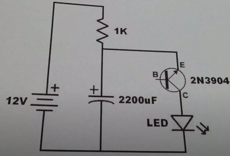 Le clignoteur. Il comprend, un condensateur, un transistor, une résistance et bien sûr une LED de 3 mm.
