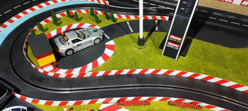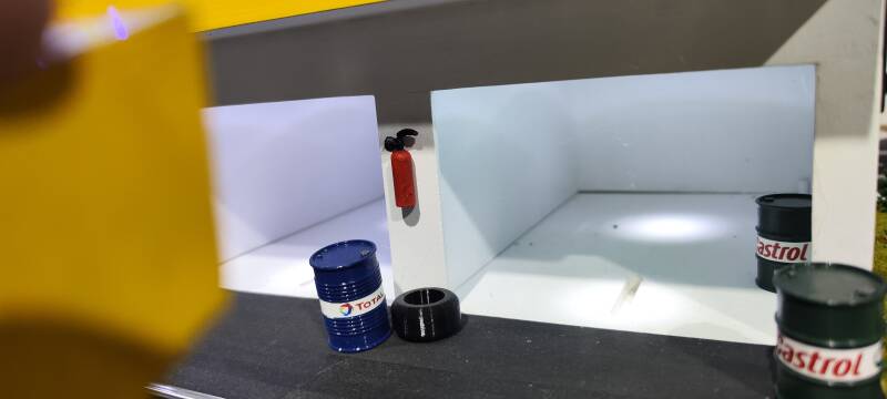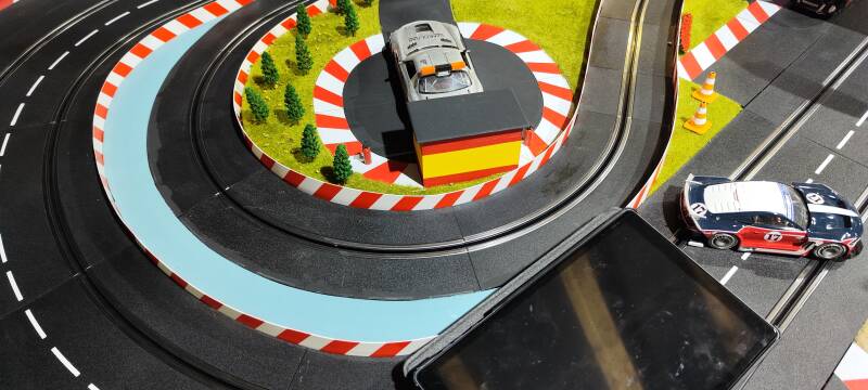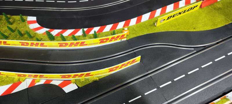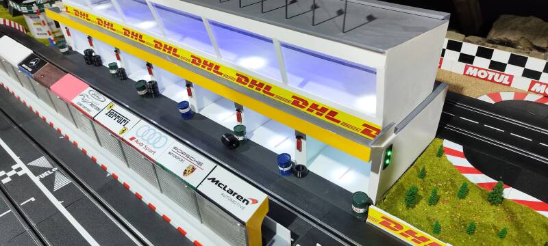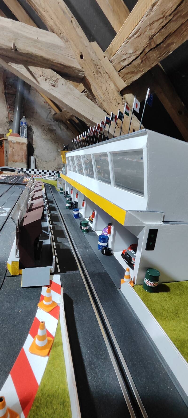 Le plateau du dessus est prévu pour recevoir le club VIP. À l'origine, j'avais posé la tribune Michelin mais la hauteur de l'ensemble était trop importante. En cas de sortie de route d'une voiture, je ne pouvais pas la remettre en piste sans passer de l'autre côté du circuit.