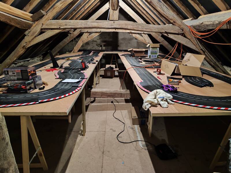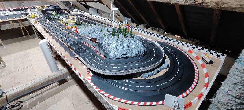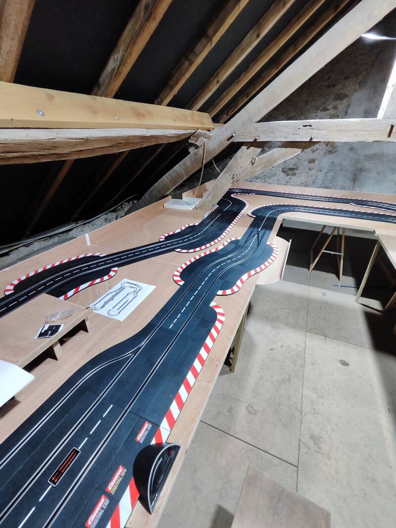 Reste la piste, j’ai passé au moins 4 mois avant de trouver un tracé agréable qui répondait aux contraintes d’espace que j’avais au grenier. Je viens de finir ma piste après beaucoup de modifications et avec l’intégration d’une Pit Lane. J’attaque la déco maintenant. Toutes les décos actuelles sont « maison » et au 1/24.
