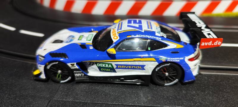 La Carrera DIGITAL 132 Mercedes AMG GT3 Evo Mercedes-AMG « Team Winward D. Schumacher, n ° 27 » DTM 2022 est le véhicule pour les fans de course moderne. Le modèle au format 1:32 impressionne par son réalisme détaillé et convainc à tout moment avec les feux avant, arrière et stop fonctionnels. La voiture de slot peut être codée individuellement, dispose d’un contrôle numérique et garantit de nombreuses heures de plaisir de conduite.